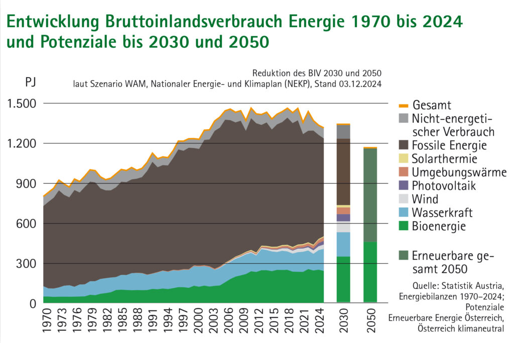 Der Bruttoinlandsverbrauch Energie in Österreich ging im Jahr 2024 auf 1.310 Petajoule (PJ) zurück, den niedrigsten Wert seit 2002. Ein Grund ist die Abnahme der Heizgradtage um 4,1 % gegenüber dem Vorjahr, obwohl 2023 bis dahin bereits das wärmste Jahr der langjährigen Messgeschichte war. Der Einsatz erneuerbarer Energieträger hat sich in den letzten 30 Jahren mehr als verdoppelt und erzielte 2024 einen Rekordwert von fast 500 PJ (ca. 140 TWh). Der Verbrauch fossiler Energieträger verzeichnete dagegen den tiefsten Stand seit 1989. Mit 48 % des Bruttoinlandsverbrauchs ist die Bioenergie die bedeutendste erneuerbare Energiequelle.Beinahe 80 % der in Österreich energetisch genutzten Biomasse sind Holzbrennstoffe (inklusive Laugen der Papierindustrie).