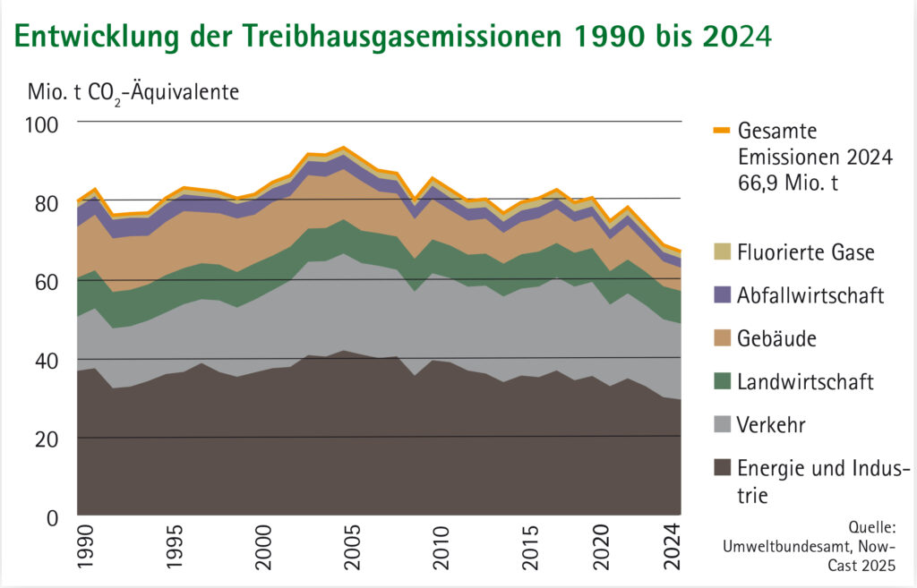 Die Treibhausgasemissionen Österreichs lagen 2024 mit 66,9 Mio. Tonnen CO2-Äquivalent (CO2äq) um 16 % unter dem Wert von 1990. Nach weitgehender Stagnation in den 2010er-Jahren sind die Emissionen ab 2022 als Folge des Ukraine-Krieges und hoher Energiepreise, aber auch durch den Ausbau erneuerbarer Energien deutlich zurückgegangen. Eine besonders hohe Abnahme verzeichnet der Gebäudesektor: Aufgrund des Ersatzes von Heizöl und Erdgas durch Holzbrennstoffe und andere erneuerbare Energien sowie der milden Witterung sind die Treibhausgasemissionen dort seit 1990 um 54 % (–7 Mio. t CO2äq) gesunken. Auch die Emissionen im Energiesektor sind durch den zunehmenden Einsatz erneuerbarer Energien zur Strom- und Fernwärmeerzeugung seit 1990 um 56 % (–8,3 Mio. t CO2äq) zurückgegangen. Durch Nutzung von Holzbrennstoffen wurden im Jahr 2024 insgesamt 9,1 Mio. Tonnen CO2äq vermieden.
