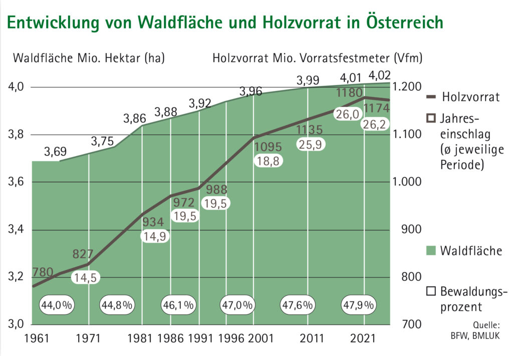 Die Holzvorräte in den österreichischen Wäldern sind in den vergangenen 60 Jahren um 51 % gestiegen. Allerdings ist der Vorrat gemäß der Österreichischen Waldinventur 2018/23 durch Sturm- und Borkenkäferschäden erstmals leicht zurückgegangen, von 1.180 auf 1.174 Millionen Vorratsfestmeter (Vfm). Der Schadholzanteil an der Holzernte lag 2024 bei 55 %, der höchste Wert seit 2019. Österreich ist mit 350 Vfm/ha im Ertragswald eines der Länder mit den weltweit höchsten Holzvorräten pro Hektar. Durch Umbau ihrer Bestände in stabile, klimafitte Mischwälder erhöhen die Waldbesitzer den Anteil von Laubholz, das zu einem weitaus größeren Teil energetisch verwertet wird als Nadelholz. Zusammen mit den zu erwartenden Erstdurchforstungen bei zahlreichen neugegründeten Beständen führt dies künftig zu einem Anstieg des Energieholzanteils an der Holzernte.