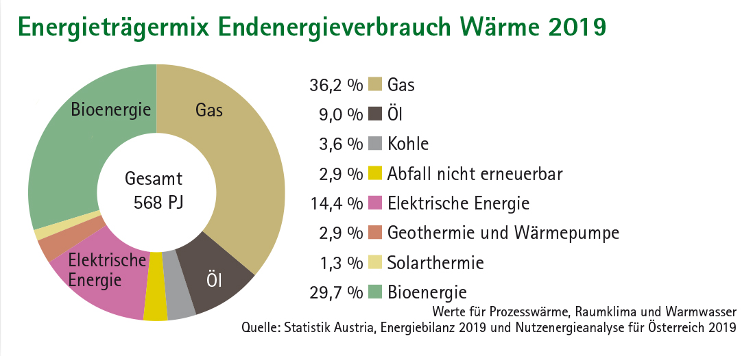 Etwa 80 Prozent der in Österreich verwendeten Biomasse werden zur Bereitstellung von Raum- und Prozesswärme eingesetzt. Innerhalb der vergangenen 20 Jahre wurden bei Kleinverbrauchern in Haushalten und Gewerbe mehr als 8.500 MW Kesselleistung in Form von Scheitholz-, Pellets- oder Hackgutkesseln sowie Kaminöfen, Herden oder Kachelöfen installiert. Etwa die Hälfte der österreichischen Haushalte verfügt über eine Form eines Holzheizsystems, wie Biomassekessel, Holzöfen oder Holzherde, oder heizt indirekt über Fern- bzw. Nahwärmeanlagen mit Holz. In Österreich produzieren etwa 2.400 Biomasse-Nahwärmeanlagen regionale Wärme. Als Folge des sinkenden Energieverbrauchs im Raumwärmemarkt wird es mittelfristig möglich sein, sehr hohe Marktanteile mit Bioenergie abzudecken und fossile Rohstoffe gänzlich zu ersetzen.