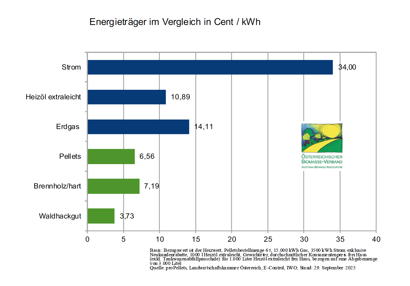 Im Vergleich mit dem September 2024 stieg der Preis für Heizöl um 1,7 % und der Gaspreis sank um rund 3 %. Der Pelletspreis stieg im Vergleich zum Vorjahresmonat um rund 9 %. Der Scheitholzpreis stieg im Jahresvergleich um rund 0,8 % und ist im September 2025 verglichen mit Heizöl um rund 34 % und im Vergleich mit Erdgas um rund 49 % günstiger. Der Preis für Waldhackgut sank gegenüber dem Vorjahresmonat um rund 4,2 % und verzeichnete gegenüber dem Vorjahresmonat den größten prozentualen Rückgang unter den Energieträgern. Der Preisvorteil von Waldhackgut gegenüber Heizöl beträgt aktuell rund 66 % und gegenüber Erdgas sogar über 73 %.